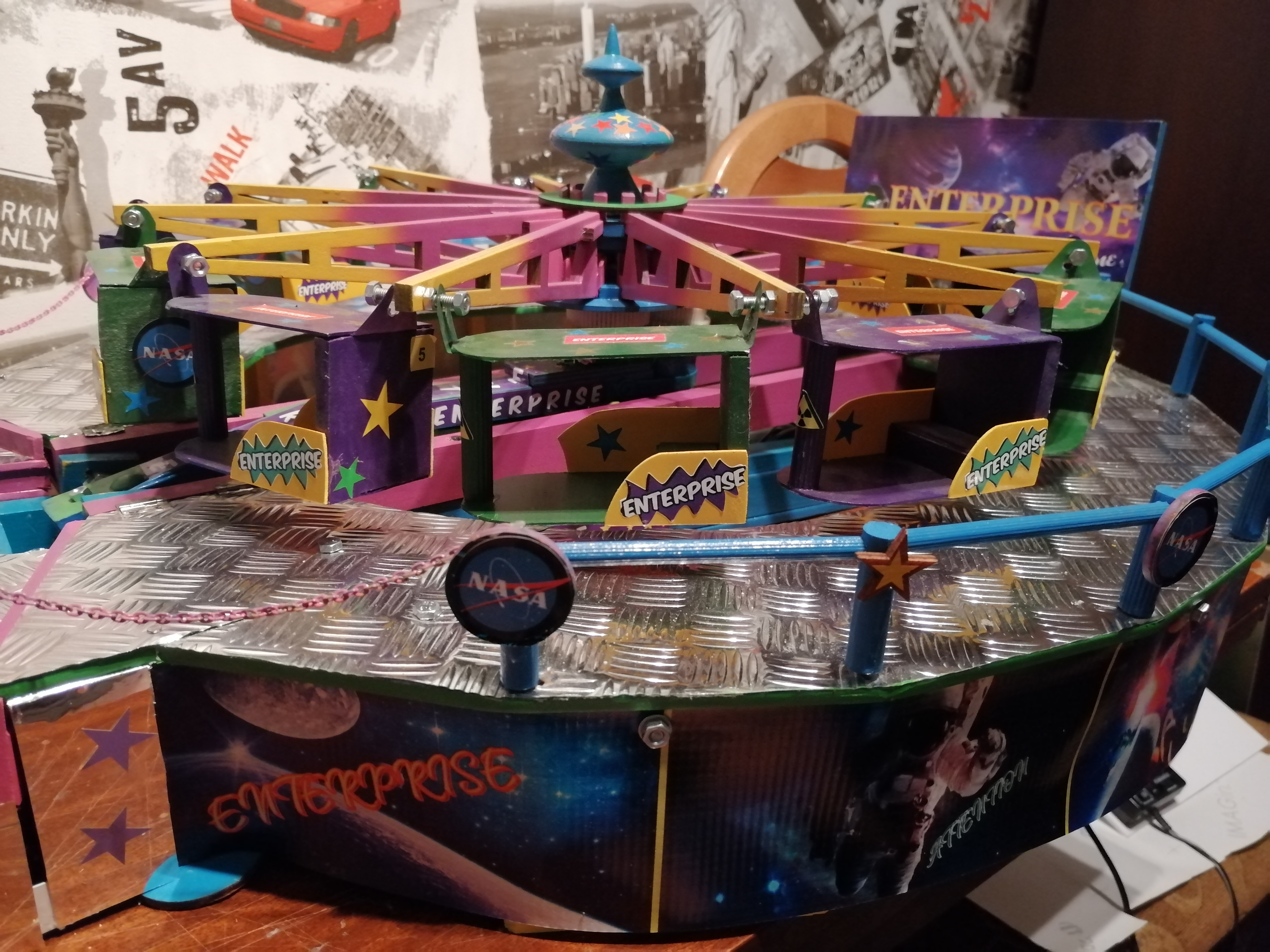 Karuzela wykonan z drewna. Pomalowana na różowo ale ma również inne elementy ozdobne ( brokat) . Elementy konstrukycjne karuzeli sklejone solidnie klejem. Dodatkowe udogodnienia : karuzela elektryczna, dzięki czemu można nią sterować .